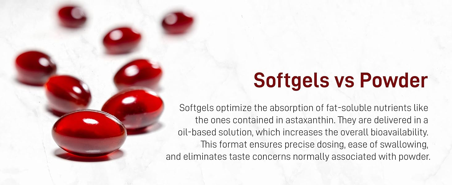 Softgels optimize the absorption of fat-soluble nutrients likethe ones contained in astaxanthin. They are delivered in aoil-based solution, which increases the overall bioavailability.This format ensures precise dosing, ease of swallowing,and eliminates taste concerns normally associated with powder.